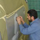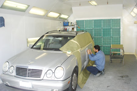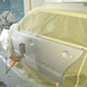 Preparations start for applying the color coat. The vehicle is covered to protect it from overspray. A primer surfacer is applied to seal the substrate and guarantee good adhesion of paint. After the surfacer hardens, it is sanded and cleaned.